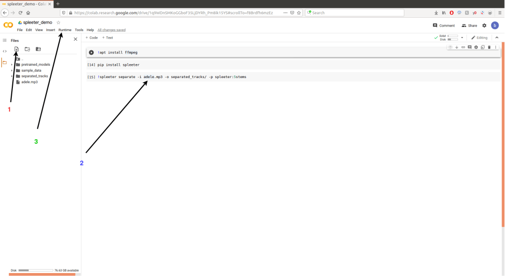 That’s it. When spleeter finishes, the outputs should be found in the separated_tracks/name_of_song folder. If you don’t see the separated_tracks folder, just click on the refresh button (the one next to the upload button).